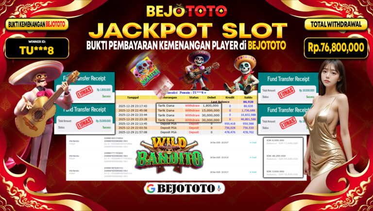 BEJOTOTO – Selamat kepada User id : aja****k* Telah berhasil mendapatkan kemenangan besar pada permainan SLOT WILD BANDITO Dengan kemenangan Sebesar Rp.54,000,000-. Setelah mengisi formulir withdraw dengan kurung waktu hanya 5 – 10 menit pihak BEJOTOTO sudah melakukan transfer kepada pemilik Userid dan dana sudah dapat di cairkan oleh pemenang. Bukti pembayaran yang kami berikan merupakan bukti pembayaran yang SAH…