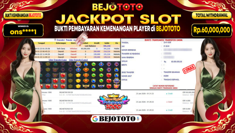 BEJOTOTO – Selamat kepada User id : ons****1 Telah berhasil mendapatkan kemenangan besar pada permainan SLOT PRAGMATIC PRAGMATIC STARLIGHT PRINCESS 1000 Dengan kemenangan Sebesar Rp.60,000,000,-. Setelah mengisi formulir withdraw dengan kurung waktu hanya 5 – 10 menit pihak BEJOTOTO sudah melakukan transfer kepada pemilik Userid dan dana sudah dapat di cairkan oleh pemenang. Bukti pembayaran yang kami berikan merupakan bukti pembayaran yang SAH…