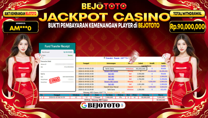 BEJOTOTO – Selamat kepada User id : AM***0 Telah berhasil mendapatkan kemenangan besar pada permainan  LIVE CASINO 48D GAMES  Dengan kemenangan Sebesar Rp.90,000,000,-. Setelah mengisi formulir withdraw dengan kurung waktu hanya 5 – 10 menit pihak BEJOTOTO sudah melakukan transfer kepada pemilik Userid dan dana sudah dapat di cairkan oleh pemenang. Bukti pembayaran yang kami berikan merupakan bukti pembayaran yang SAH / VALID yang langung di dapatkan melaui tanda transfer transaksi dari Bank yang di tuju.