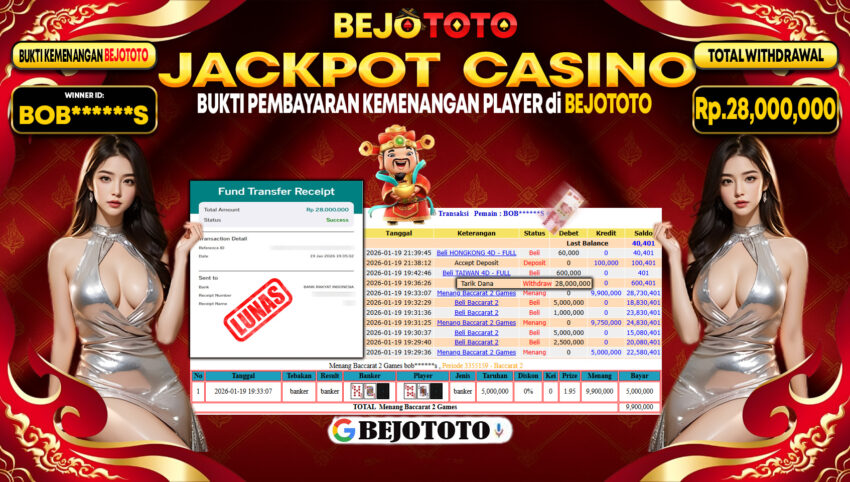 BEJOTOTO – Selamat kepada User id : BOB******S Telah berhasil mendapatkan kemenangan besar pada permainan  LIVE CASINO BACCARAT 2 GAMES Dengan kemenangan Sebesar Rp.28,000,000,-. Setelah mengisi formulir withdraw dengan kurung waktu hanya 5 – 10 menit pihak BEJOTOTO sudah melakukan transfer kepada pemilik Userid dan dana sudah dapat di cairkan oleh pemenang. Bukti pembayaran yang kami berikan merupakan bukti pembayaran yang SAH / VALID yang langung di dapatkan melaui tanda transfer transaksi dari Bank yang di tuju.