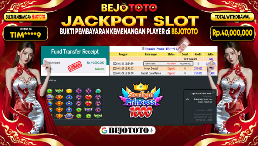 BEJOTOTO – Selamat kepada User id : TIM****9 Telah berhasil mendapatkan kemenangan besar pada permainan SLOT PRAGMATIC PRAGMATIC STARLIGHT PRINCESS 1000 Dengan kemenangan Sebesar Rp.40,000,000,-. Setelah mengisi formulir withdraw dengan kurung waktu hanya 5 – 10 menit pihak BEJOTOTO sudah melakukan transfer kepada pemilik Userid dan dana sudah dapat di cairkan oleh pemenang. Bukti pembayaran yang kami berikan merupakan bukti pembayaran yang SAH / VALID yang langung di dapatkan melaui tanda transfer transaksi dari Bank yang di tuju.