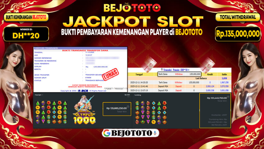 BEJOTOTO – Selamat kepada User id : DH**20 Telah berhasil mendapatkan kemenangan besar pada permainan  SLOT PRAGMATIC GATES OF OLYMPUS 1000  Dengan kemenangan Sebesar Rp.135,000,000,-. Setelah mengisi formulir withdraw dengan kurung waktu hanya 5 – 10 menit pihak BEJOTOTO sudah melakukan transfer kepada pemilik Userid dan dana sudah dapat di cairkan oleh pemenang. Bukti pembayaran yang kami berikan merupakan bukti pembayaran yang SAH / VALID yang langung di dapatkan melaui tanda transfer transaksi dari Bank yang di tuju.