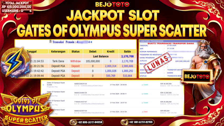 BEJOTOTO – Selamat kepada User id : D*****2 Telah berhasil mendapatkan kemenangan besar pada permainan SLOT PRAGMATIC GATES OF OLYMPUS SUPER SCATTER Dengan kemenangan Sebesar Rp.105,000,000,-. Setelah mengisi formulir withdraw dengan kurung waktu hanya 5 – 10 menit pihak BEJOTOTO sudah melakukan transfer kepada pemilik Userid dan dana sudah dapat di cairkan oleh pemenang. Bukti pembayaran yang kami berikan merupakan bukti pembayaran yang SAH / VALID yang langung di dapatkan melaui tanda transfer transaksi dari Bank yang di tuju.