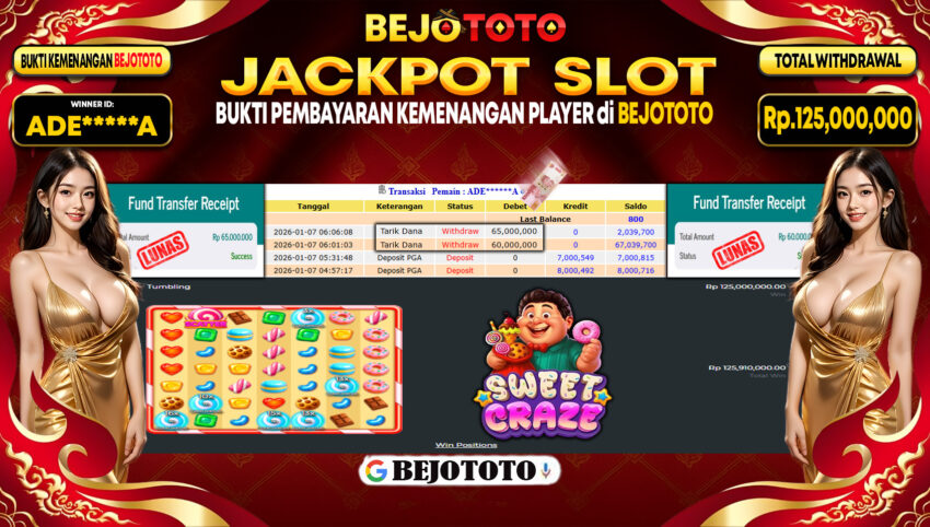 BEJOTOTO – Selamat kepada User id : ADE******A Telah berhasil mendapatkan kemenangan besar pada permainan  SLOT PRAGMATIC SWEET CRAZE Dengan kemenangan Sebesar Rp.125,000,000,-. Setelah mengisi formulir withdraw dengan kurung waktu hanya 5 – 10 menit pihak BEJOTOTO sudah melakukan transfer kepada pemilik Userid dan dana sudah dapat di cairkan oleh pemenang. Bukti pembayaran yang kami berikan merupakan bukti pembayaran yang SAH / VALID yang langung di dapatkan melaui tanda transfer transaksi dari Bank yang di tuju.