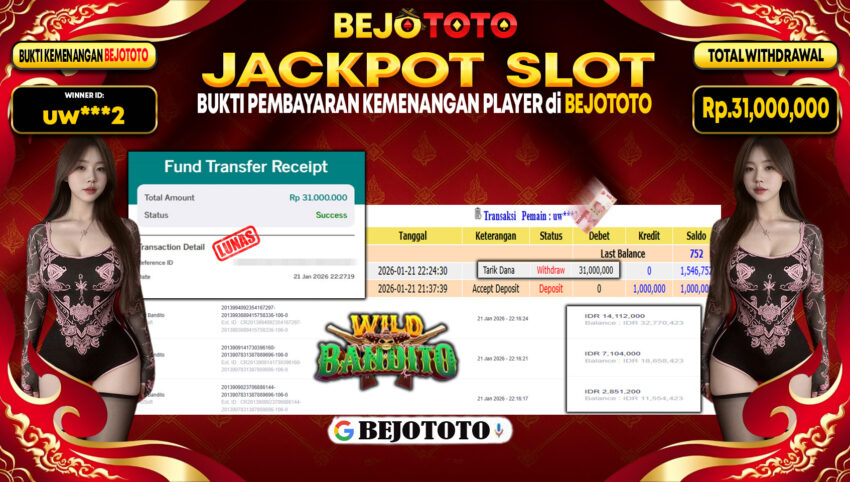 BEJOTOTO – Selamat kepada User id : uw***2 Telah berhasil mendapatkan kemenangan besar pada permainan SLOT WILD BANDITO Dengan kemenangan Sebesar Rp.31,000,000-. Setelah mengisi formulir withdraw dengan kurung waktu hanya 5 – 10 menit pihak BEJOTOTO sudah melakukan transfer kepada pemilik Userid dan dana sudah dapat di cairkan oleh pemenang. Bukti pembayaran yang kami berikan merupakan bukti pembayaran yang SAH / VALID yang langung di dapatkan melaui tanda transfer transaksi dari Bank yang di tuju.