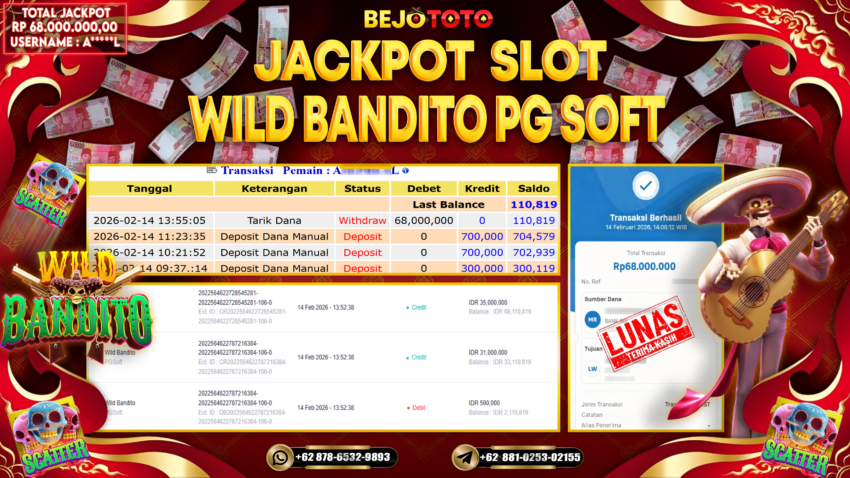BEJOTOTO – Selamat kepada User id : A*****L Telah berhasil mendapatkan kemenangan besar pada permainan SLOT WILD BANDITO Dengan kemenangan Sebesar Rp.68,000,000-. Setelah mengisi formulir withdraw dengan kurung waktu hanya 5 – 10 menit pihak BEJOTOTO sudah melakukan transfer kepada pemilik Userid dan dana sudah dapat di cairkan oleh pemenang. Bukti pembayaran yang kami berikan merupakan bukti pembayaran yang SAH / VALID yang langung di dapatkan melaui tanda transfer transaksi dari Bank yang di tuju.