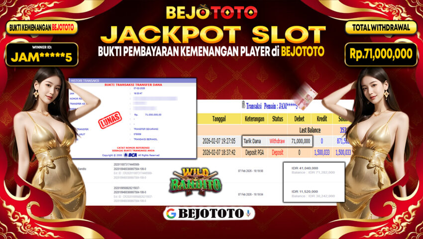 BEJOTOTO – Selamat kepada User id : JAM*****5 Telah berhasil mendapatkan kemenangan besar pada permainan SLOT WILD BANDITO Dengan kemenangan Sebesar Rp.71,000,000-. Setelah mengisi formulir withdraw dengan kurung waktu hanya 5 – 10 menit pihak BEJOTOTO sudah melakukan transfer kepada pemilik Userid dan dana sudah dapat di cairkan oleh pemenang. Bukti pembayaran yang kami berikan merupakan bukti pembayaran yang SAH / VALID yang langung di dapatkan melaui tanda transfer transaksi dari Bank yang di tuju.